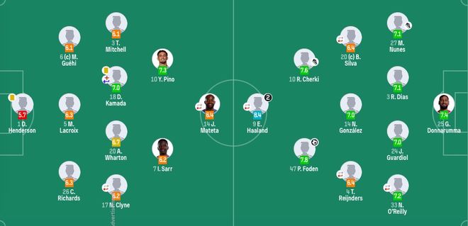曼城首发:25-多纳鲁马、27-努内斯、3-鲁本·迪亚斯、24-格瓦迪奥尔、33-奥赖利(91'21-努里)、14-尼科、20-B席(91'82-刘易斯)、4-赖因德斯(85'26-萨维尼奥)、47-福登、10-谢尔基、9-哈兰德(91'7-马尔穆什)